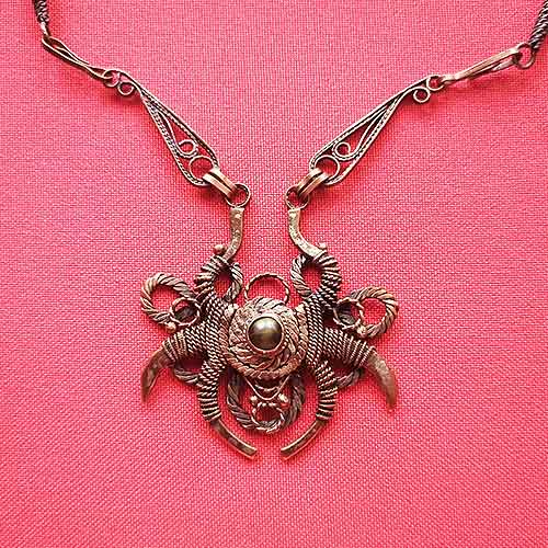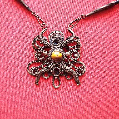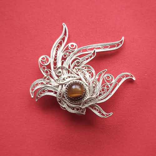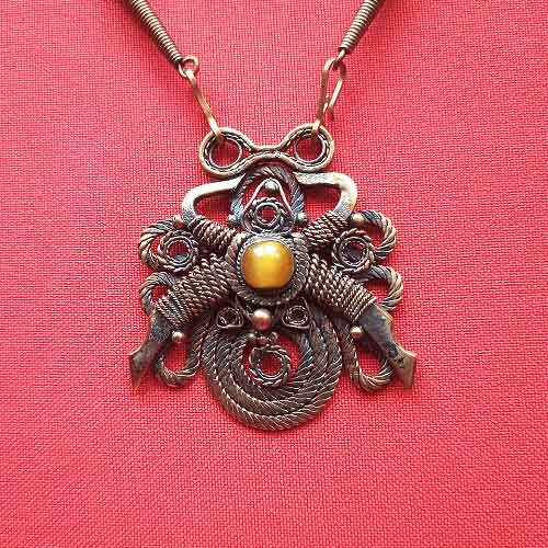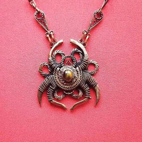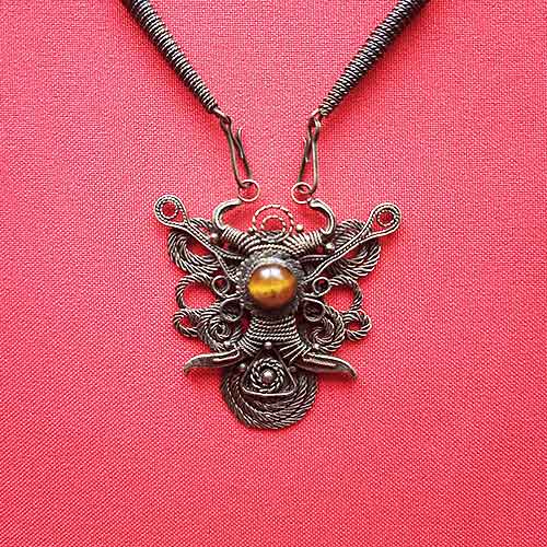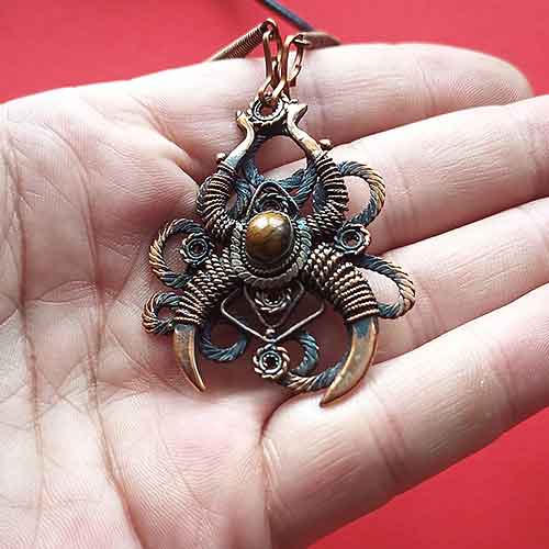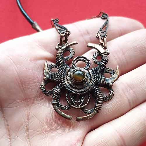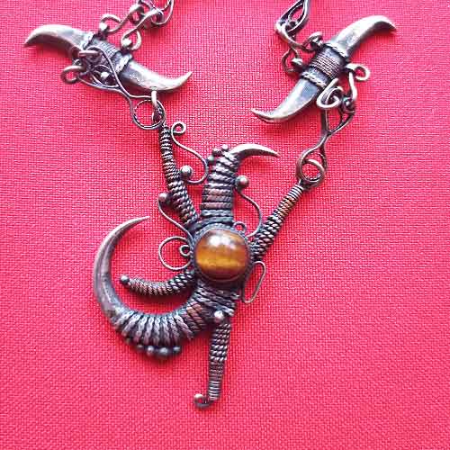 Представлены в галерее амулеты Затмение, Парад планет, с тигровым глазом, Амулет Глаз Шивы с соколиным глазом. Амулеты Взгляд вглубь, Дух грозы, Индийский мотив, Парад планет, Амулет Древо жизни с тигровым глазом. Броши с агатом, с аквамарином, бирюзой, лунным камнем, тигровым глазом. Кольца с бирюзой, янтарем филигрань. Колье "Когти", серьги с авантюрином, серьги "Когти".
